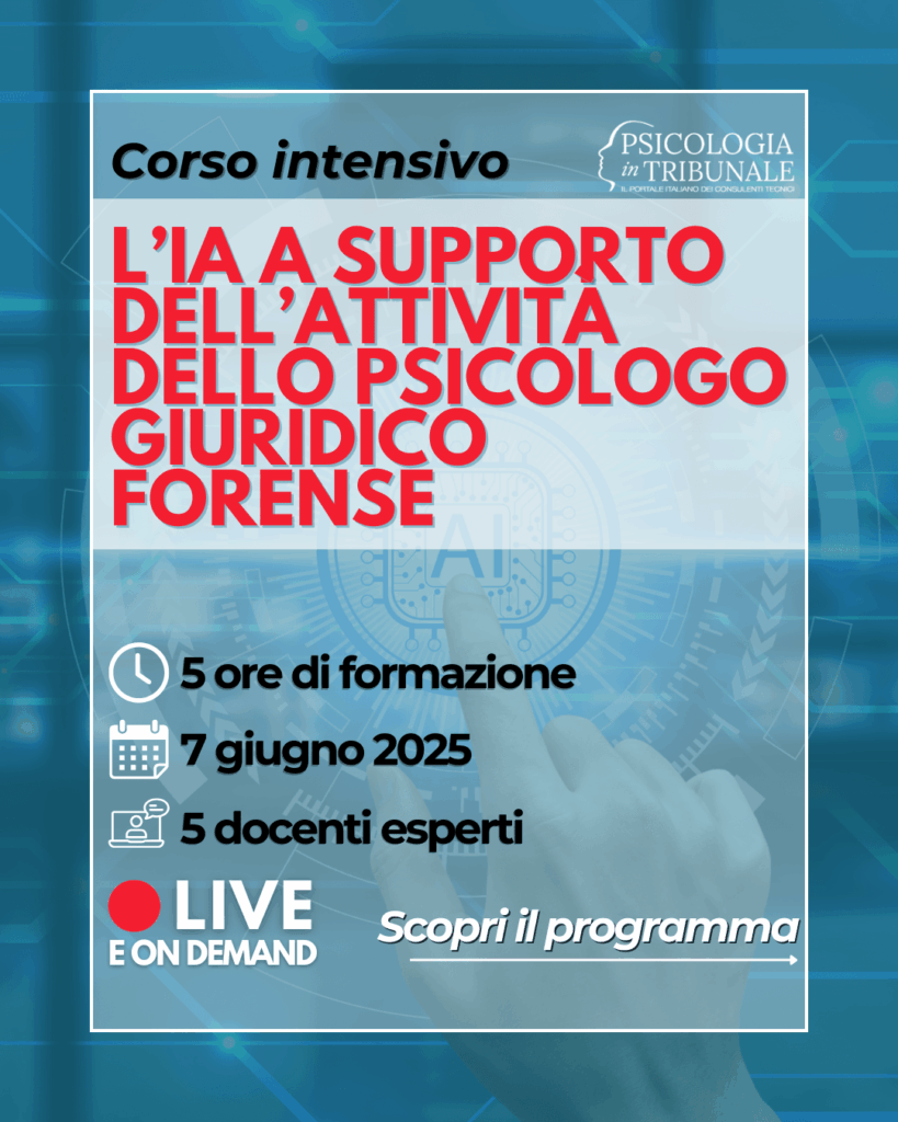 Il corso si svolgerà Live sabato 7 giugno 2025, e vedrà la partecipazione tra i docenti di personalità del mondo psicologico e giuridico, come il Prof. Giuseppe Sartori e l’avv. Giampaolo Di Marco, e la cofondatrice di PiT, Stefania Tucci, nonché di Sara D’Angelo e Alessia Mensurati, psicologhe ed esperte collaboratrici della Redazione di PiT.