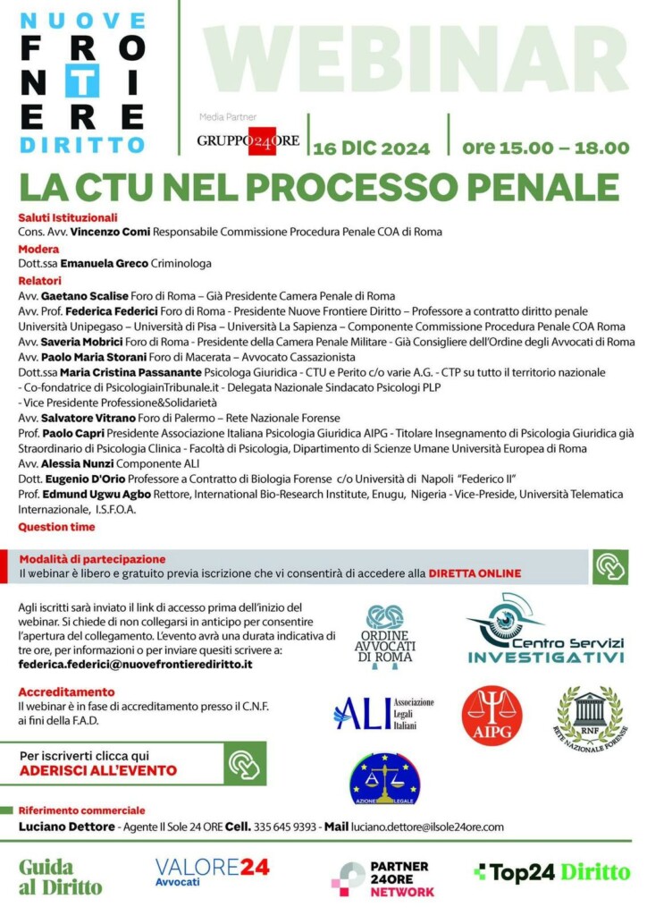 L’Associazione forense Nuove Frontiere del Diritto organizza il webinar intitolato “La CTU nel Processo Penale”, un’occasione formativa dedicata ad approfondire il ruolo cruciale delle consulenze tecniche nel contesto giudiziario penale.