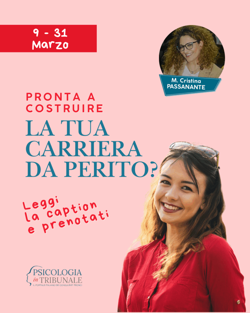 Un’ora gratuita one to one con Psicologia in Tribunale insieme a Maria Cristina Passanante, co-founder di Psicologia in Tribunale ed esperta in psicologia giuridica e forense.
